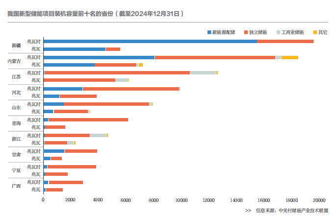 從新型儲能項目的區(qū)域分布看,裝機(jī)容量前十省份的容量均已達(dá)到吉瓦時級別,內(nèi)蒙古成為我國首個新型儲能裝機(jī)容量超過1吉瓦的省份。在各類儲能技術(shù)中,鋰離子電池技術(shù)成為裝機(jī)占比最大的儲能技術(shù),占比達(dá)到55.2%。其他技術(shù)也取得了顯著進(jìn)展。例如,首個300兆瓦級壓縮空氣儲能項目實現(xiàn)并網(wǎng),我國最大百兆瓦級鈉離子電池儲能項目并網(wǎng),百兆瓦級重力儲能首套充放電單元測試成功,百兆瓦級飛輪儲能電站進(jìn)入建設(shè)階段。