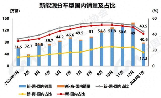 乘聯(lián)分會(huì)不久前公布的數(shù)據(jù)中,亦有同樣有類似的趨勢。在乘用車市場,2025年1月,新能源車國內(nèi)滲透率跌至41.5%,雖然較去年同期有所提升,但環(huán)比跌幅近八個(gè)百分點(diǎn)。此外,新能源車月度滲透率已經(jīng)連續(xù)5個(gè)月環(huán)比下滑。