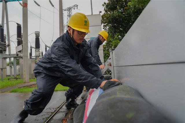 國網(wǎng)安徽安慶岳西縣供電公司員工裝沙袋加固城西變電站圍墻,防范臺風(fēng)影響變電站設(shè)備安全運(yùn)行。