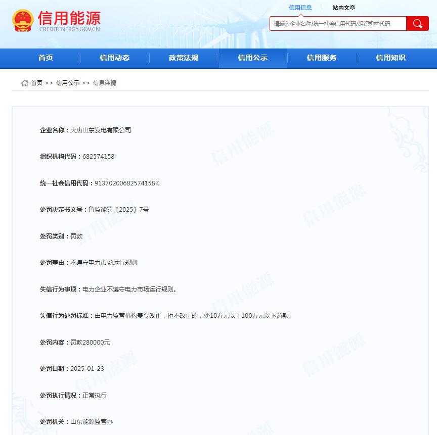 日前,信用能源公示了對大唐山東發(fā)電有限公司的行政處罰決定,處罰決定書文號魯監(jiān)能罰〔2025〕7號顯示,大唐山東發(fā)電有限公司不遵守電力市場運行規(guī)則,山東能源監(jiān)管辦依據(jù)《山東省電力市場監(jiān)管辦法(試行)》《電力監(jiān)管條例》相關(guān)規(guī)定,對其處以罰款280000元處罰。