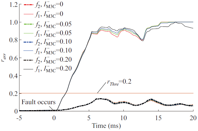 本文對圖1所示的帶有3個(gè)風(fēng)電場的低頻輸電系統(tǒng)進(jìn)行了仿真。計(jì)算結(jié)果表明:1)如圖3所示,區(qū)外故障時(shí),由本端模量信息計(jì)算的電壓反行波在故障暫態(tài)階段基本與由對端模量計(jì)算的電壓反行波重合,區(qū)內(nèi)故障下二者差異明顯;2)不同M3C負(fù)序電流指令下的電壓反行波差異仿真結(jié)果如圖4所示,結(jié)果表明,基于電壓反行波差異的縱聯(lián)保護(hù)在區(qū)內(nèi)故障時(shí)在能在5 ms內(nèi)可靠動作,而在區(qū)外故障時(shí)不動作。所提保護(hù)不受換流器故障控制策略影響,且具有較高的靈敏度。