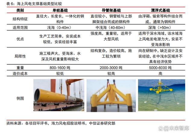 塔筒、樁基是風電設備中的支撐基礎部件,分別用于連接和承載風電機組、支撐和固 定整機。風電塔筒除塔體外,其內(nèi)部通常有爬梯、電纜梯、平臺等內(nèi)部結構,以供風電機 組的運營及維護使用。風電支撐基礎分為單樁、導管架和漂浮式基礎三類,淺海區(qū)域中機 組安裝在下端深入海床地基的樁基或導管架上,由海床地基提供支撐;深海區(qū)域中樁基、 導管架有長度限制,無法實現(xiàn)支撐功能,漂浮式基礎主要由浮箱及錨繩組成,浮箱為海上 風電機組提供支撐力,并通過錨索或纜繩將塔筒與海底相連,使機組可以在某一相對固定 的區(qū)域內(nèi)自由移動。
