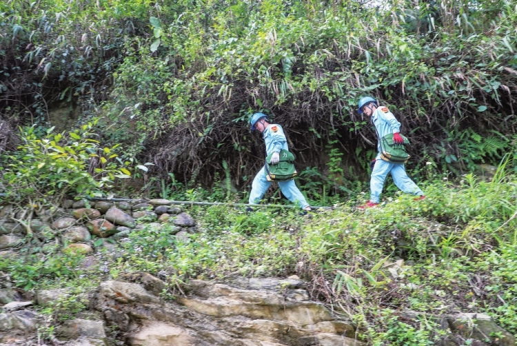 1. 黨員服務(wù)隊(duì)隊(duì)員在花海中巡視維護(hù)供電線路。