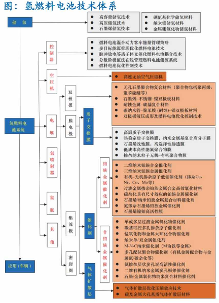 燃料電池系統(tǒng)是以燃料電池堆為基本單元,增加必要的輔助零部件構(gòu)成的一套完整的發(fā)電系統(tǒng)。氫燃料電池系統(tǒng)復(fù)雜,主要由電堆和系統(tǒng)部件(空壓機、增濕器、氫循環(huán)泵、氫瓶)組成;電堆是整個電池系統(tǒng)的核心, 包括由膜電極、雙極板構(gòu)成的各電池單元以及集流板、端板、密封圈等;膜電極的關(guān)鍵材料是質(zhì)子交換膜、催化劑、氣體擴散層,這些部件及材料的耐久性等性能決定了電堆的使用壽命和工況適應(yīng)性。