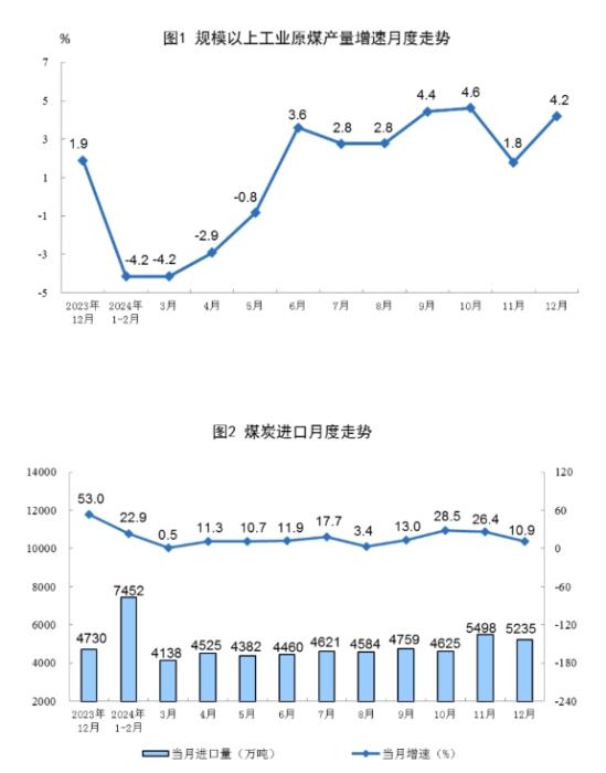 原煤生產(chǎn)增速加快。12月份,規(guī)上工業(yè)原煤產(chǎn)量4.4億噸,同比增長(zhǎng)4.2%,增速比11月份加快2.4個(gè)百分點(diǎn);日均產(chǎn)量1415.6萬噸。進(jìn)口煤炭5235萬噸,同比增長(zhǎng)10.9%。
