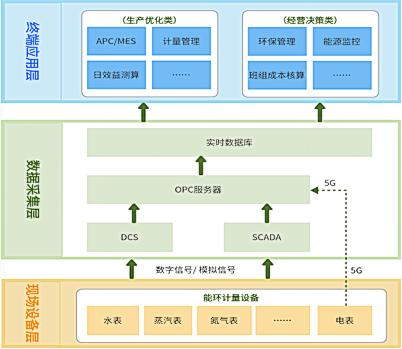 該體系主要由現(xiàn)場設(shè)備層、數(shù)據(jù)采集層、終端應(yīng)用層等組成。他們根據(jù)工藝與計量要求,先后配備了帶信號遠傳功能、高準確度等級的質(zhì)量流量計、電磁流量計、超聲波流量計等智能型計量儀表,實現(xiàn)一、二級能源計量表配備率達100%。通過計量儀表傳輸端采集能源計量數(shù)據(jù),上傳至DCS或SCADA系統(tǒng),再通過OPC接口上傳至實時數(shù)據(jù)庫,采用5G無線傳輸技術(shù)解決偏遠區(qū)域計量儀表信號的數(shù)據(jù)采集與傳輸,最終為終端系統(tǒng)提供有效數(shù)據(jù)支持。