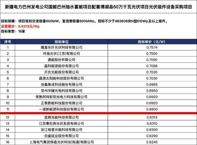 記者了解到,上述采購(gòu)項(xiàng)目的投標(biāo)企業(yè)共有16家,11家企業(yè)報(bào)出了高于或與0.69元/W持平的價(jià)格。其中,隆基綠能旗下的隆基樂(lè)葉給出了0.7574元/W的最高報(bào)價(jià),一道新能的報(bào)價(jià)為0.69元/W,與協(xié)會(huì)最近一次發(fā)布的組件成本價(jià)一致。