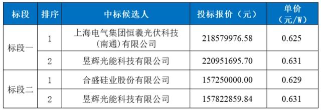 剩余5家企業(yè)報(bào)價(jià)則明顯低于光伏協(xié)會(huì)發(fā)布的組件成本價(jià),報(bào)價(jià)范圍在0.6245元/W—0.6313元/W。上述采購(gòu)項(xiàng)目?jī)蓚€(gè)標(biāo)段的中標(biāo)候選人包括上海電氣集團(tuán)恒羲光伏科技(南通)有限公司、昱輝光能科技有限公司以及合盛硅業(yè)。