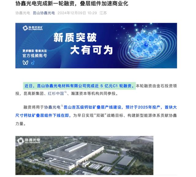 就在12月初,協(xié)鑫集團旗下鈣鈦礦業(yè)務(wù)核心企業(yè)——昆山協(xié)鑫光電材料有限公司(下稱“協(xié)鑫光電”)宣布,公司已經(jīng)完成近5億元C1輪融資。該輪融資由金石投資領(lǐng)投,昆高新集團、紅杉中國、瀚漾資本等機構(gòu)共同參投。光源資本擔(dān)任本輪融資獨家財務(wù)顧問。