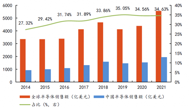 2014 -2021 全球、 中國(guó)半導(dǎo)體銷售額和占比