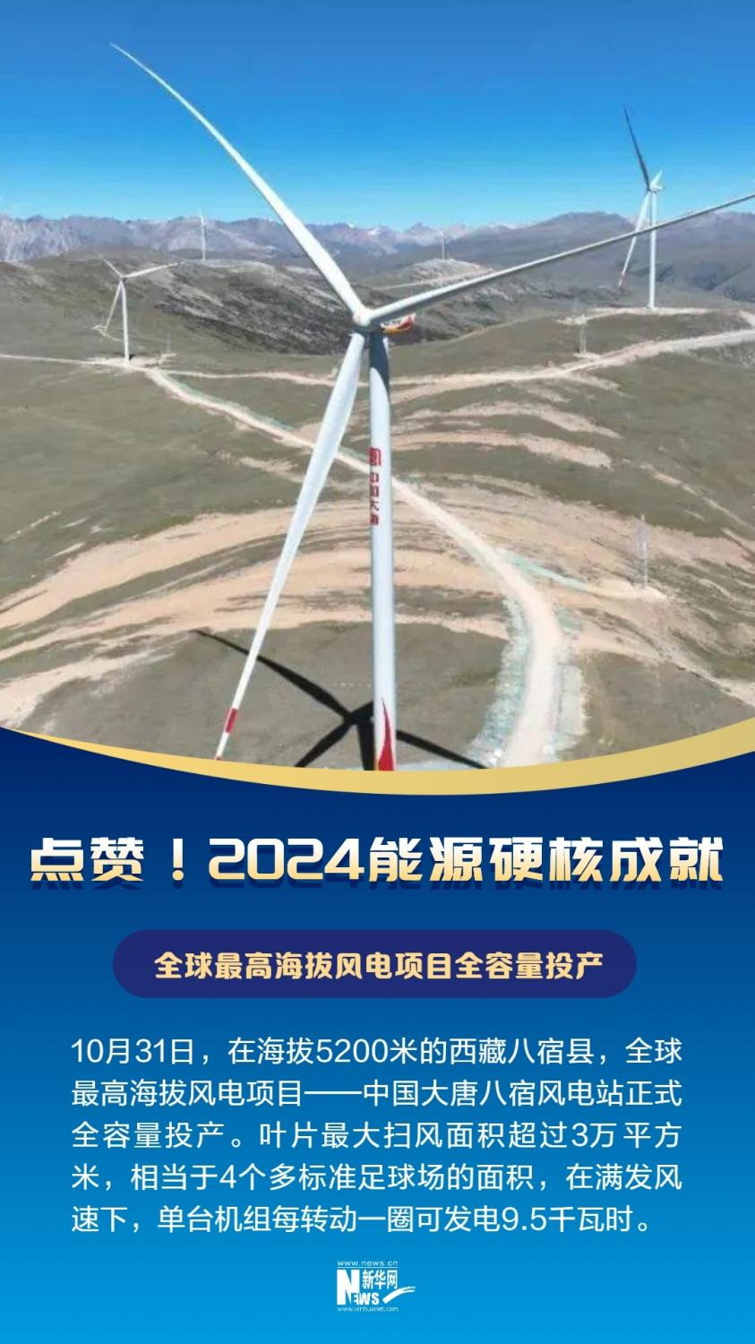 10月31日,在海拔5200米的西藏昌都市八宿縣,全球最高海拔風(fēng)電項目——中國大唐八宿風(fēng)電站正式全容量投產(chǎn)。項目共安裝20臺風(fēng)電機組,風(fēng)機輪轂中心高度110米,葉輪直徑195米,葉片最大掃風(fēng)面積超過3萬平方米,相當于4個多標準足球場的面積,在滿發(fā)風(fēng)速下,單臺機組每轉(zhuǎn)動一圈可發(fā)電9.5千瓦時。