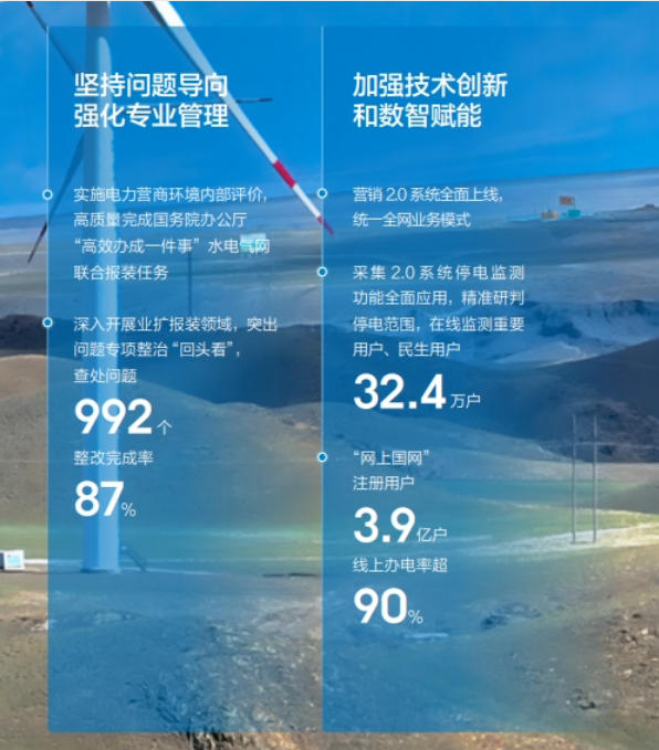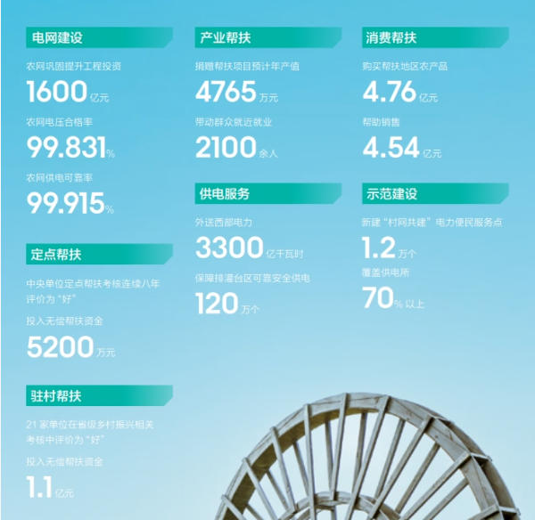 農(nóng)網(wǎng)鞏固提升工程投資1600億元,農(nóng)網(wǎng)電壓合格率99.831%,農(nóng)網(wǎng)供電可靠率99.915%;捐贈幫扶項目預(yù)計年產(chǎn)值4765萬元,帶動群眾就近就業(yè)2100余人;投入無償幫扶資金1.1億元。