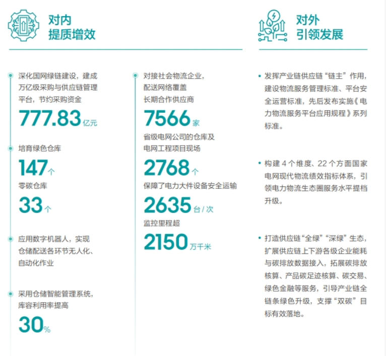 打造綠色數(shù)智供應(yīng)鏈,對內(nèi)深化國網(wǎng)綠鏈建設(shè),建成萬億級采購與供應(yīng)鏈管理平臺,節(jié)約采購資金777.83億元;對外構(gòu)建4個維度、22個方面國家電網(wǎng)現(xiàn)代物流績效指標體系,引領(lǐng)電力物流生態(tài)圈服務(wù)水平提檔升級。