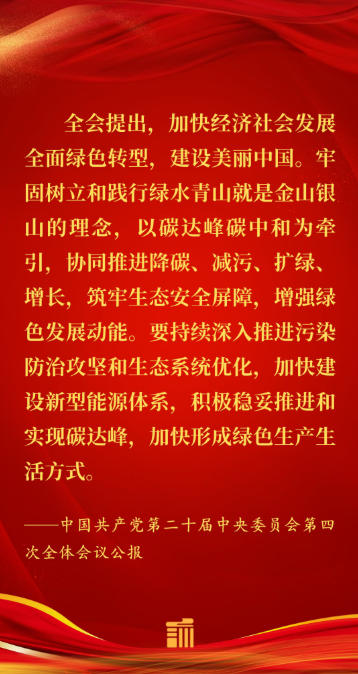 全會(huì)提出,加快經(jīng)濟(jì)社會(huì)發(fā)展全面綠色轉(zhuǎn)型,建設(shè)美麗中國(guó)。牢固樹(shù)立和踐行綠水青山就是金山銀山的理念,以碳達(dá)峰碳中和為牽引,協(xié)同推進(jìn)降碳、減污、擴(kuò)綠、增長(zhǎng),筑牢生態(tài)安全屏障,增強(qiáng)綠色發(fā)展動(dòng)能。要持續(xù)深入推進(jìn)污染防治攻堅(jiān)和生態(tài)系統(tǒng)優(yōu)化,加快建設(shè)新型能源體系,積極穩(wěn)妥推進(jìn)和實(shí)現(xiàn)碳達(dá)峰,加快形成綠色生產(chǎn)生活方式。