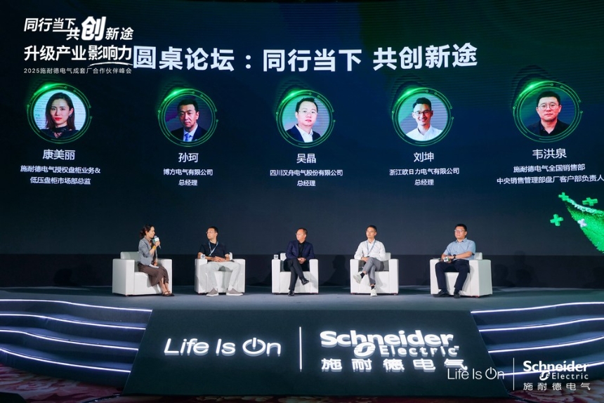峰會(huì)現(xiàn)場(chǎng),在以“同行當(dāng)下,共創(chuàng)新途”為主題的圓桌論壇中,博方電氣有限公司總經(jīng)理孫珂、四川漢舟電氣股份有限公司總經(jīng)理吳晶、浙江歐日力電氣有公司總經(jīng)理劉坤、施耐德電氣授權(quán)盤柜業(yè)務(wù)&低壓盤柜市場(chǎng)部總監(jiān)康美麗、施耐德電氣全國(guó)銷售部中央銷售管理部盤廠客戶部負(fù)責(zé)人韋洪泉齊聚一堂,共同探討行業(yè)發(fā)展新趨勢(shì),詳細(xì)分享與施耐德電氣聯(lián)合創(chuàng)新合作經(jīng)驗(yàn),為行業(yè)轉(zhuǎn)型提供可復(fù)制、可落地的實(shí)踐案例,合力打造更具韌性與創(chuàng)新活力的協(xié)作生態(tài)。