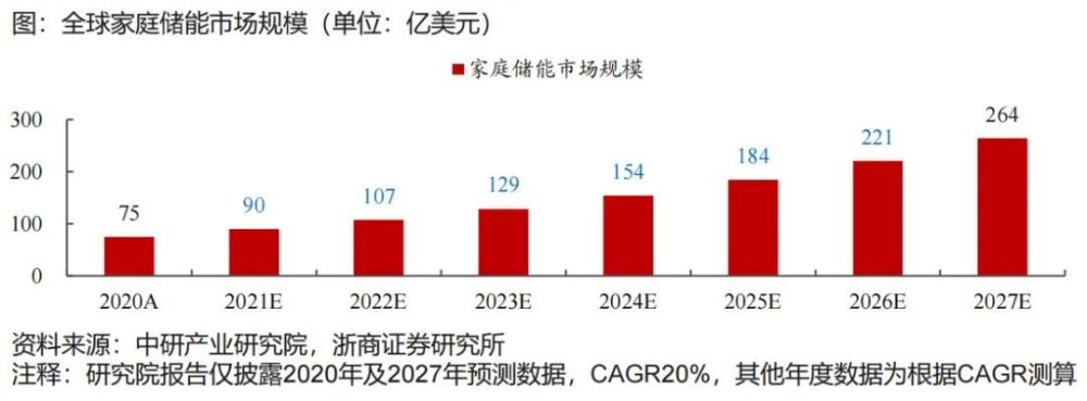 家庭儲能:由于海外電價昂貴+電網穩(wěn)定性有待提升,根據(jù)中研產業(yè)研究院發(fā)布,2020年全球家庭儲能規(guī)模約75億美元,預計至2027年達264億美金,cagr20%。具體如下圖所示: