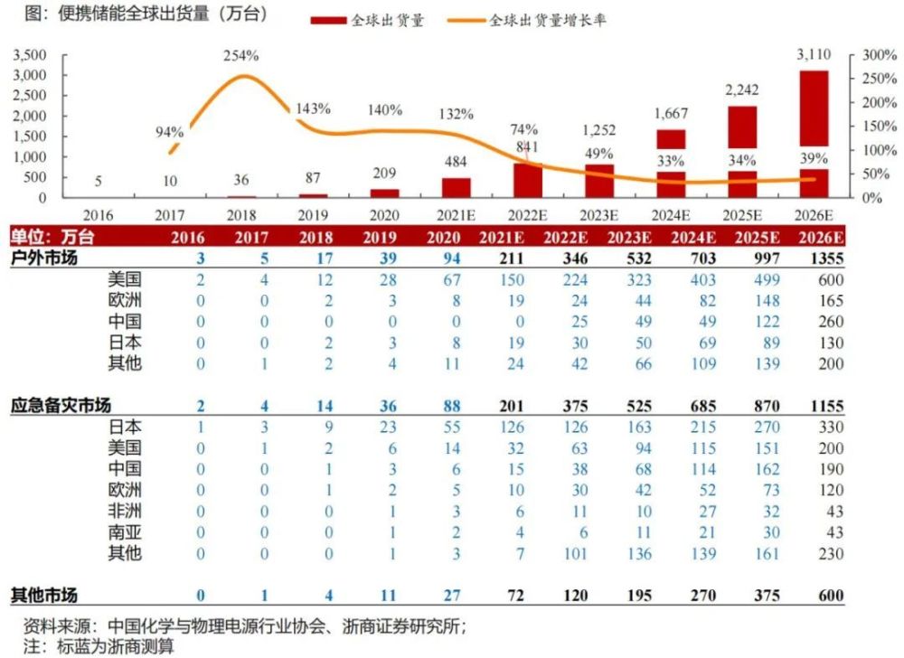 便攜儲能,全球出貨量快速增長,根據(jù)中國化學與物理電源協(xié)會數(shù)據(jù)測算,預計20-26年CAGR為57%;按照不同需求用途又分為三類: