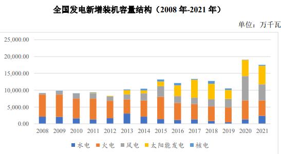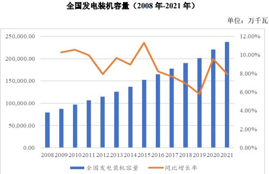 近年來,我國發(fā)電裝機(jī)容量持續(xù)增長,風(fēng)電、核電以及太陽能發(fā)電等裝機(jī)規(guī)模增速較快。根據(jù)中電聯(lián)的統(tǒng)計,截至 2021 年底,全國發(fā)電裝機(jī)容量 237,692萬千瓦,同比增長 7.9%。其中,火電 129,678 萬千瓦,同比增長 4.1%;水電 39,092萬千瓦,同比增長 5.6%;風(fēng)電 32,848 萬千瓦,同比增長 16.6%;核電 5,326 萬千瓦,同比增長 6.8%;太陽能發(fā)電 30,656 萬千瓦,同比增長 20.9%。