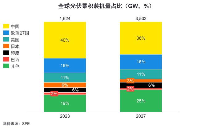 據(jù)歐洲光伏協(xié)會(huì)(SPE)數(shù)據(jù)顯示,2023年全球光伏裝機(jī)總量已達(dá)1624吉瓦,在中等情景預(yù)測(cè)下,2027年全球裝機(jī)總量將顯著增長(zhǎng)至3532吉瓦,復(fù)合增長(zhǎng)率將高達(dá)21%。從區(qū)域來看,2023年中國(guó)以656吉瓦的光伏累計(jì)裝機(jī)容量穩(wěn)居全球第一,占比為40%,歐盟和美國(guó)緊隨其后,裝機(jī)容量分別為263吉瓦、173吉瓦。根據(jù)歐洲光伏協(xié)會(huì)(SPE)預(yù)測(cè),到2027年,全球光伏裝機(jī)格局預(yù)計(jì)保持不變。值得關(guān)注的是,過去幾年,中國(guó)、美國(guó)和巴西的光伏裝機(jī)容量增長(zhǎng)速度均超過了全球平均增速27%,其中巴西光伏因其裝機(jī)容量基數(shù)較小,其增速更是達(dá)到了74%的驚人速度。